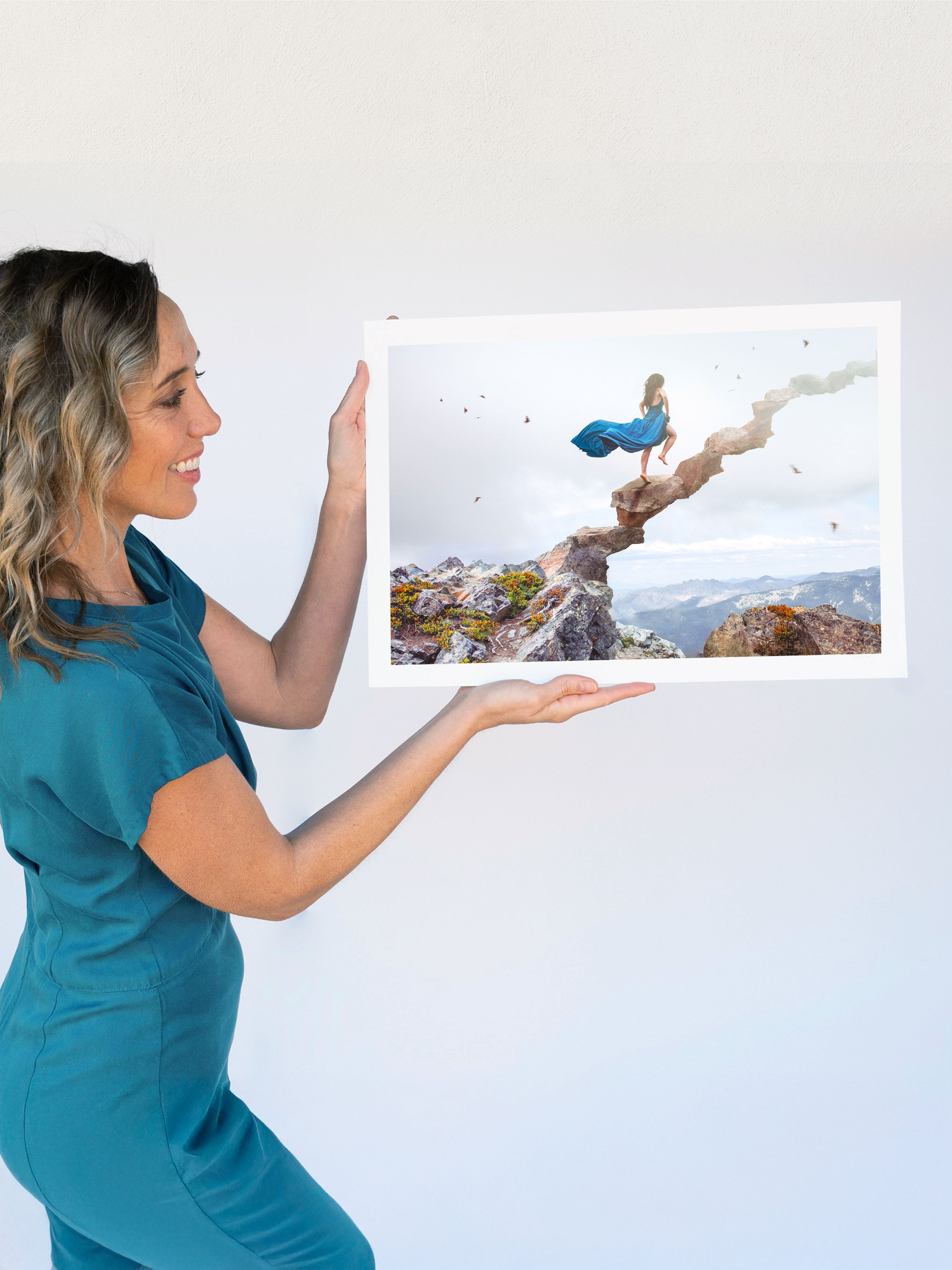 Embrace the captivating world of "Raised to Wonder," a celebration of childlike awe and the beauty of discovery. In this whimsical scene, a woman in a bright red dress gracefully balances on a yellow ball, surrounded by an array of colorful orbs that dance across a wide, open sky. Set against the rocky landscape and tranquil water pools of Enchanted Rock State Park, this artwork embodies the peace that comes from resting in wonder, free from the pressures of striving.