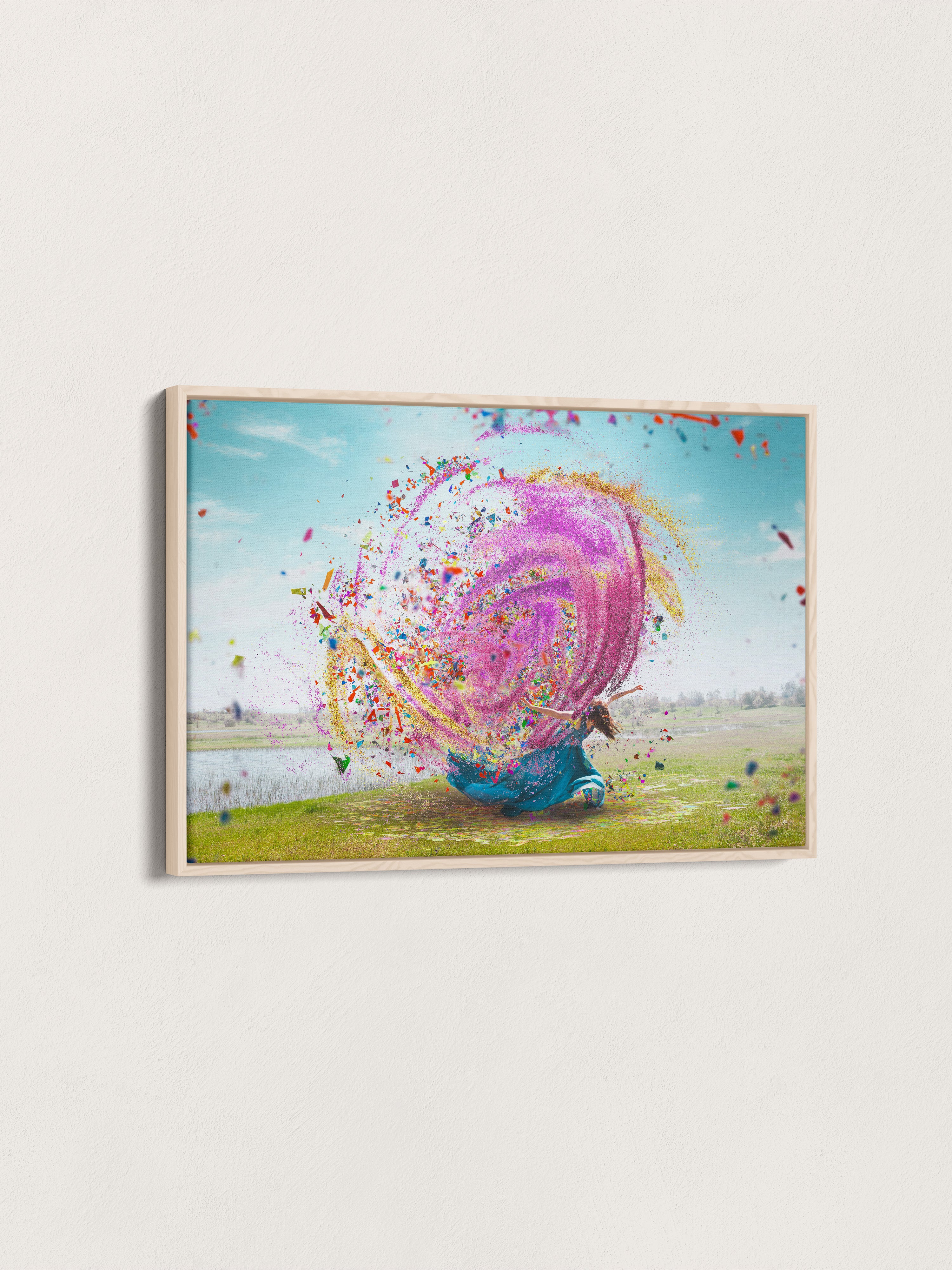 Let "The Thrill of Grace" remind you of the exhilarating, lifting power of God’s grace. Set against the wide-open sands of central Washington’s White Bluffs, this vibrant scene captures a cascade of colorful spheres, symbolizing grace overflowing in every direction. The figure, lifted high in a flowing teal dress, embodies the boundless freedom that comes from relying on something greater than oneself. Grace doesn’t just lift you—it propels you forward, carrying you over every obstacle, every mountain, and into adventures you never thought possible.