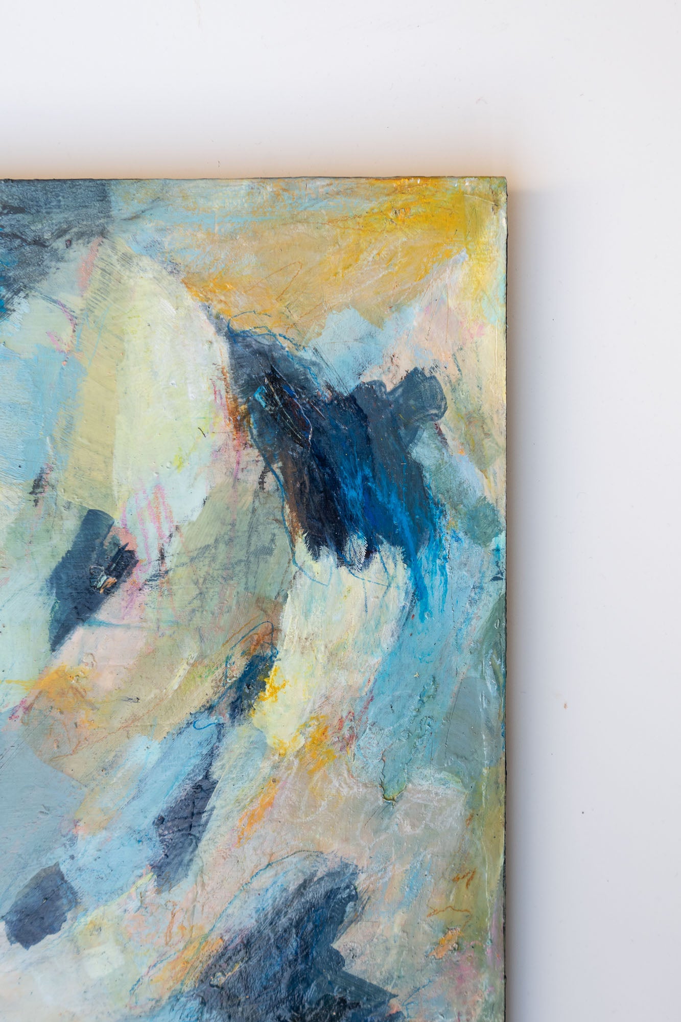 A rhythmic mix of moody blues and golden orange light, like the sky after rain or the sea at sunrise. Unframed wood panel. Shipping included within the contiguous U.S.