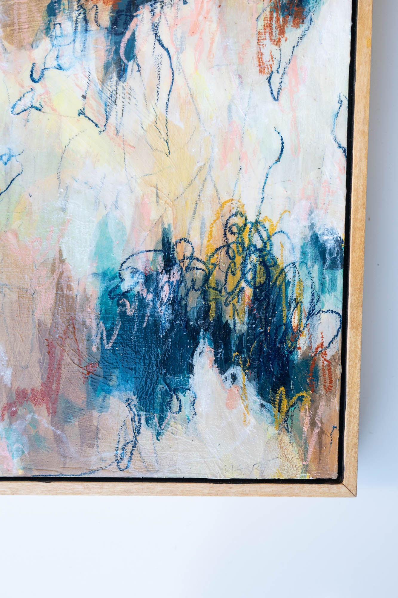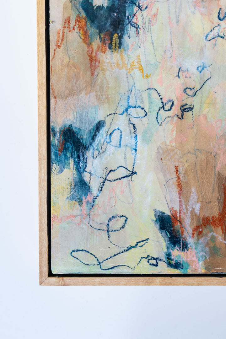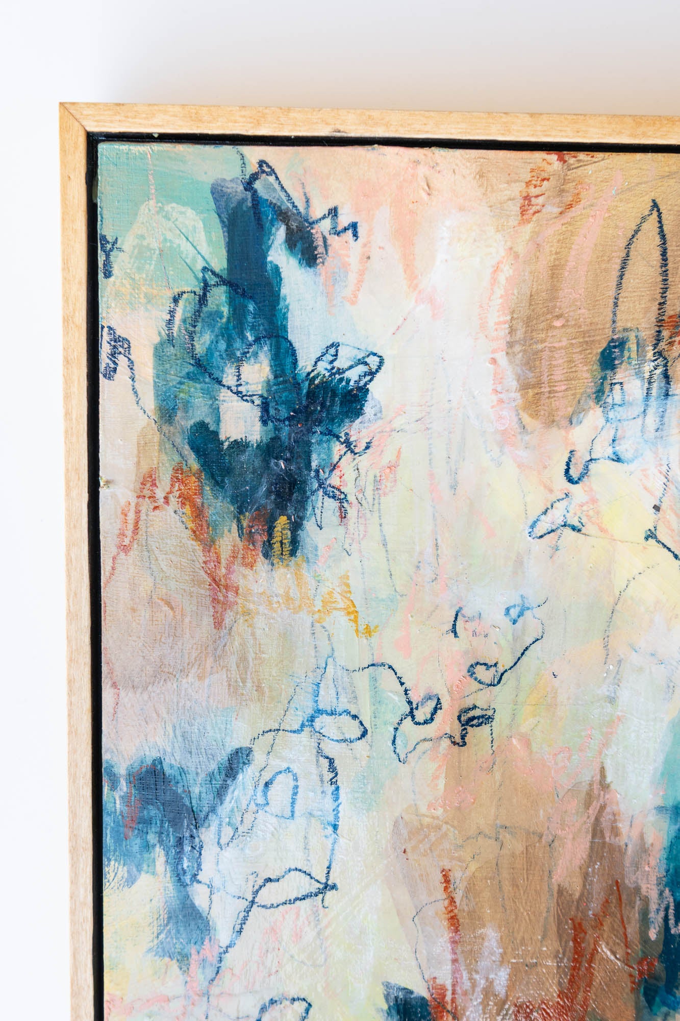 Whimsical and lyrical, this abstract painting features creamy neutrals, navy accents, and playful color loops—like music in motion. Framed in natural wood, ready to hang. Shipping included within the contiguous U.S.
