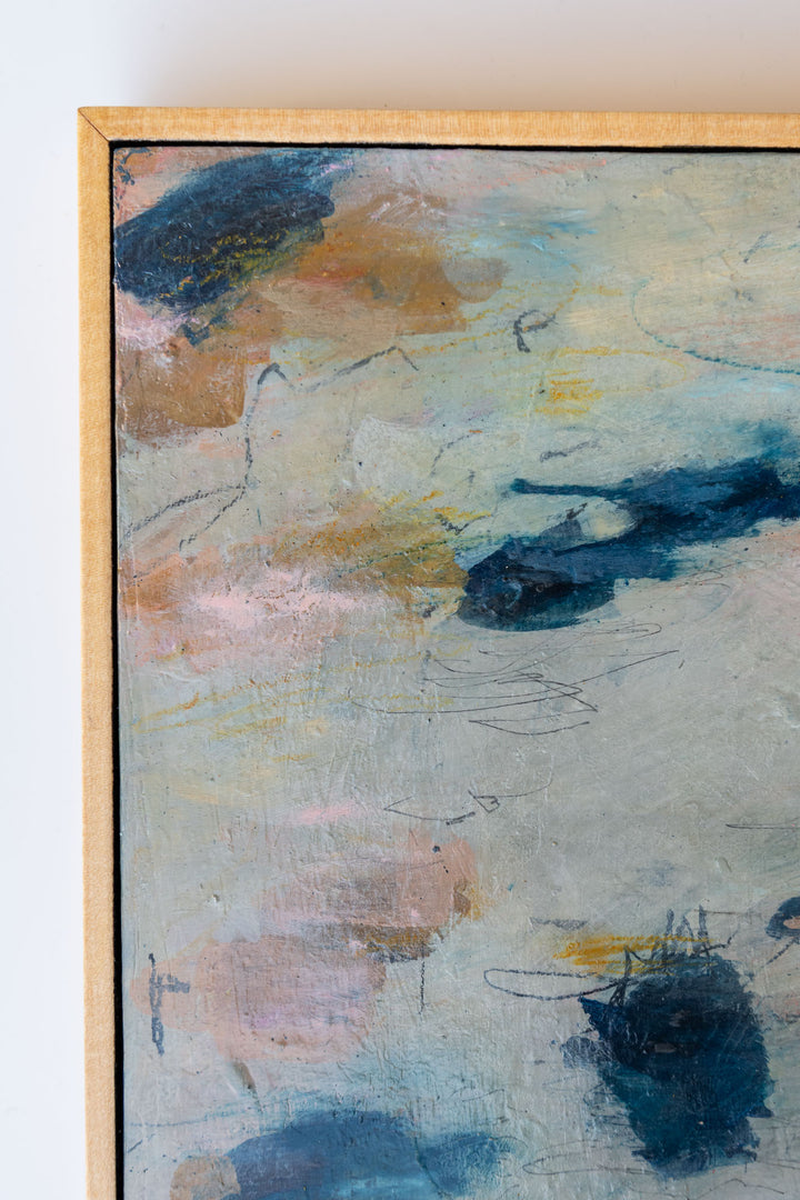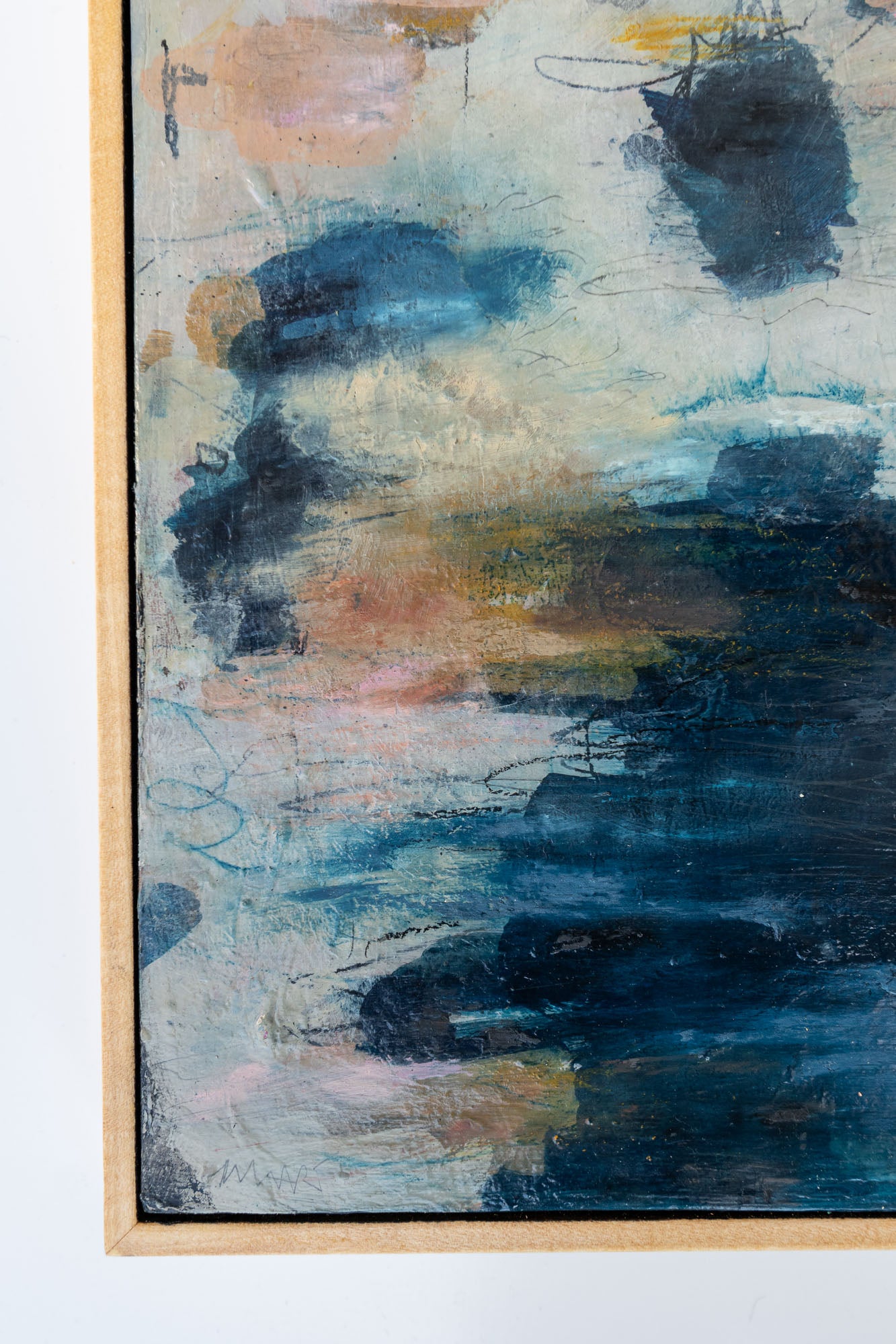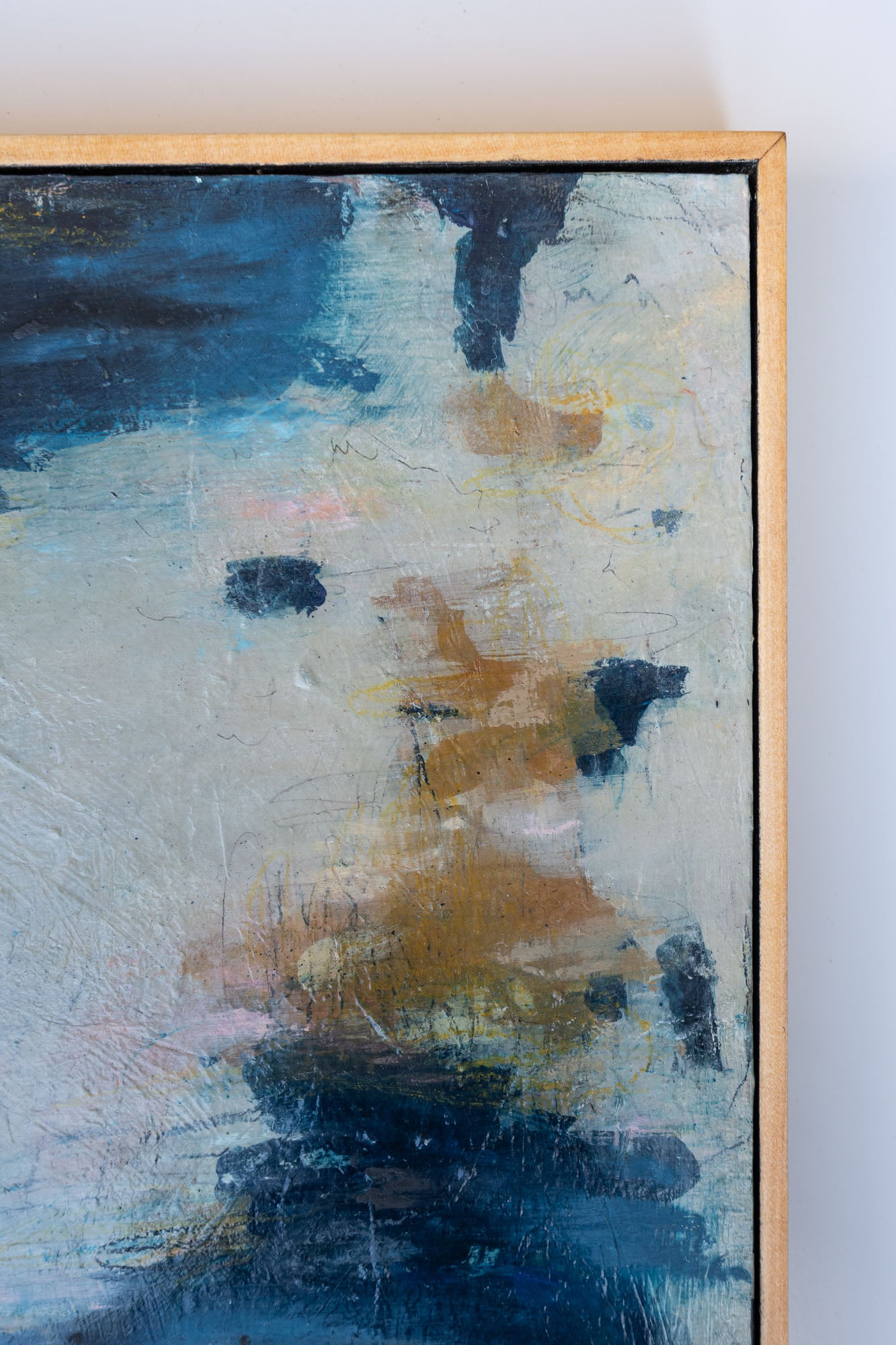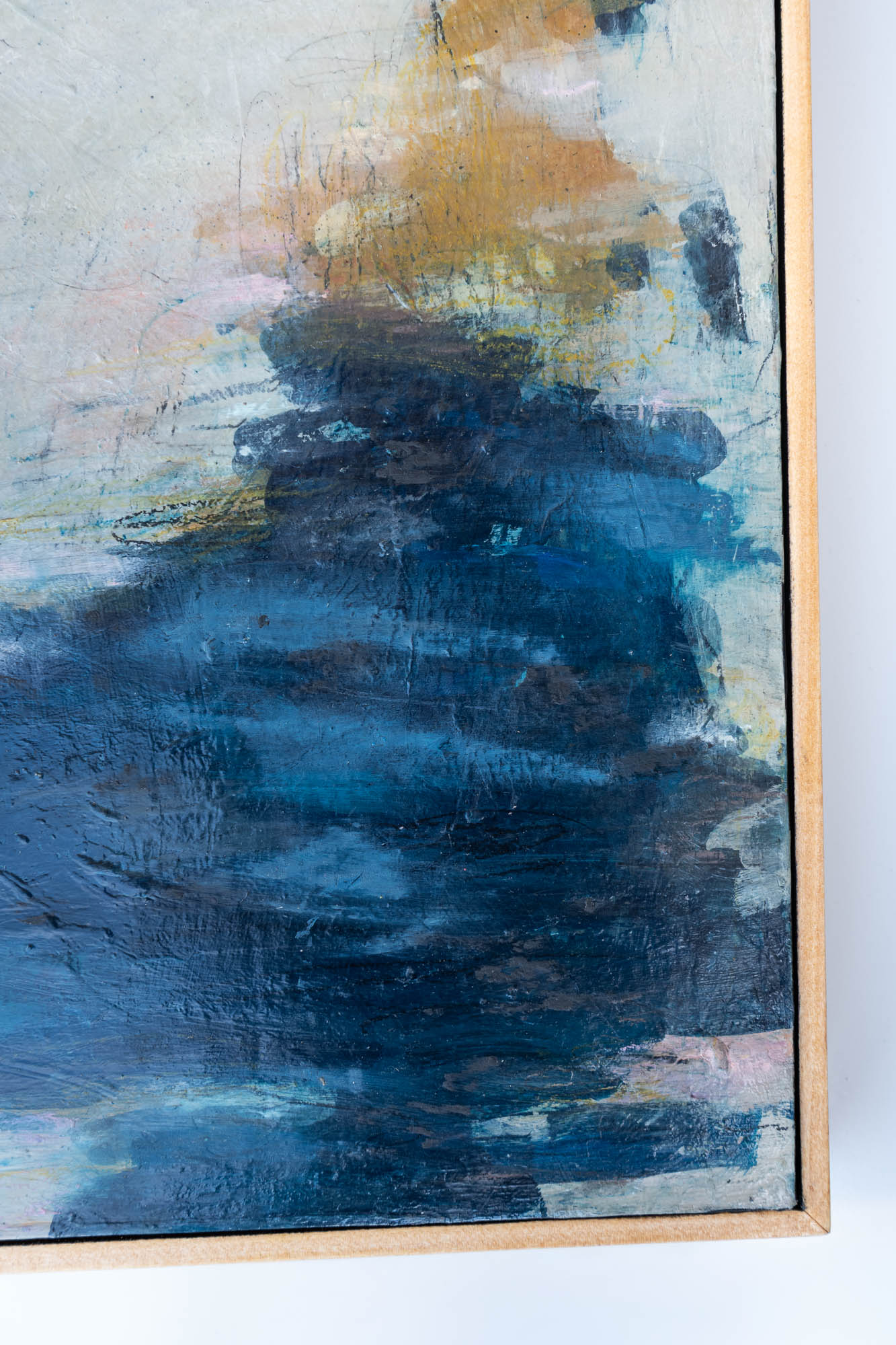 Deep blues and soft golds rise from a grounding background in this calm, balanced piece. Rich texture and quiet energy. Framed, ready to hang. Shipping included within the contiguous U.S.